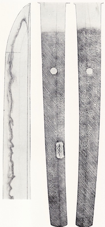 From our examples you can also see that he included a kokuin like his fathers based on the characters Hoホ Soソ Kawa川 (see Kaei 5 nen mei). His eldest son Chôjuken Ushinosuke Tadamasa went on to become a smith working for the Nobeoka Han but still signed Soshû Sakura shi Tadamasa. His second son, Yoshinori remained in Sakura working with his father and eventually assuming his position as Han-smith. There are a number of gassaku works between Tadayoshi and Yoshinori, see the Keio 2 nen mei.