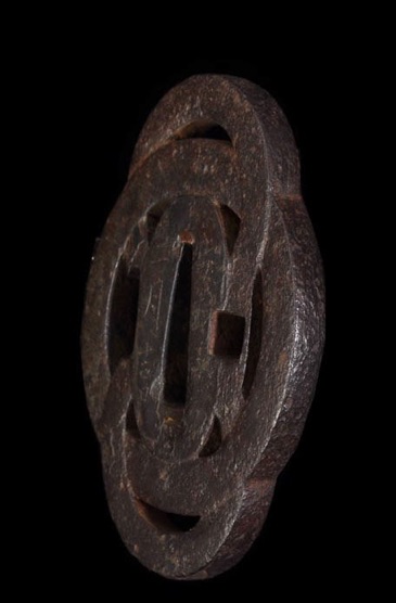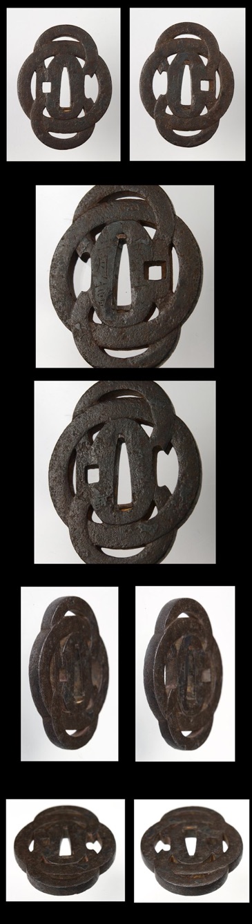 The design was what struck me as most appealing, I felt I had seen something similar before but wasn’t sure, since it was most certainly not a common one for tsuba as far as I knew. I was reminded of chain-mail though knowledgeable friends disabused me of that idea and said I should be looking at mon. Sure enough in my mon references I found several similar designs known as 鉄輪 “kana-wa” or metal rings, so it could be chain-mail but according to my little book these represent the five happinesses. There are several variations including just two, three or four rings. One question you have to ask yourself looking at this is, is this three rings or do we include the circle of the seppa-dai as a fourth? And what about that odd square hole?
