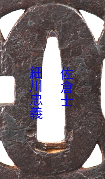 Masayoshi signed Saku-shû Tsuyama jû (作州津山住) while Tadayoshi signed Sakura-shi (佐倉士) and clearly the Sa character could with a little help be made to look like the Saku character. It is possible this is what someone tried to do to this little tsuba. The key character, the Tada character, is almost completely lost. This too could have been removed to make it easier to pass this off as the work of Masayoshi.